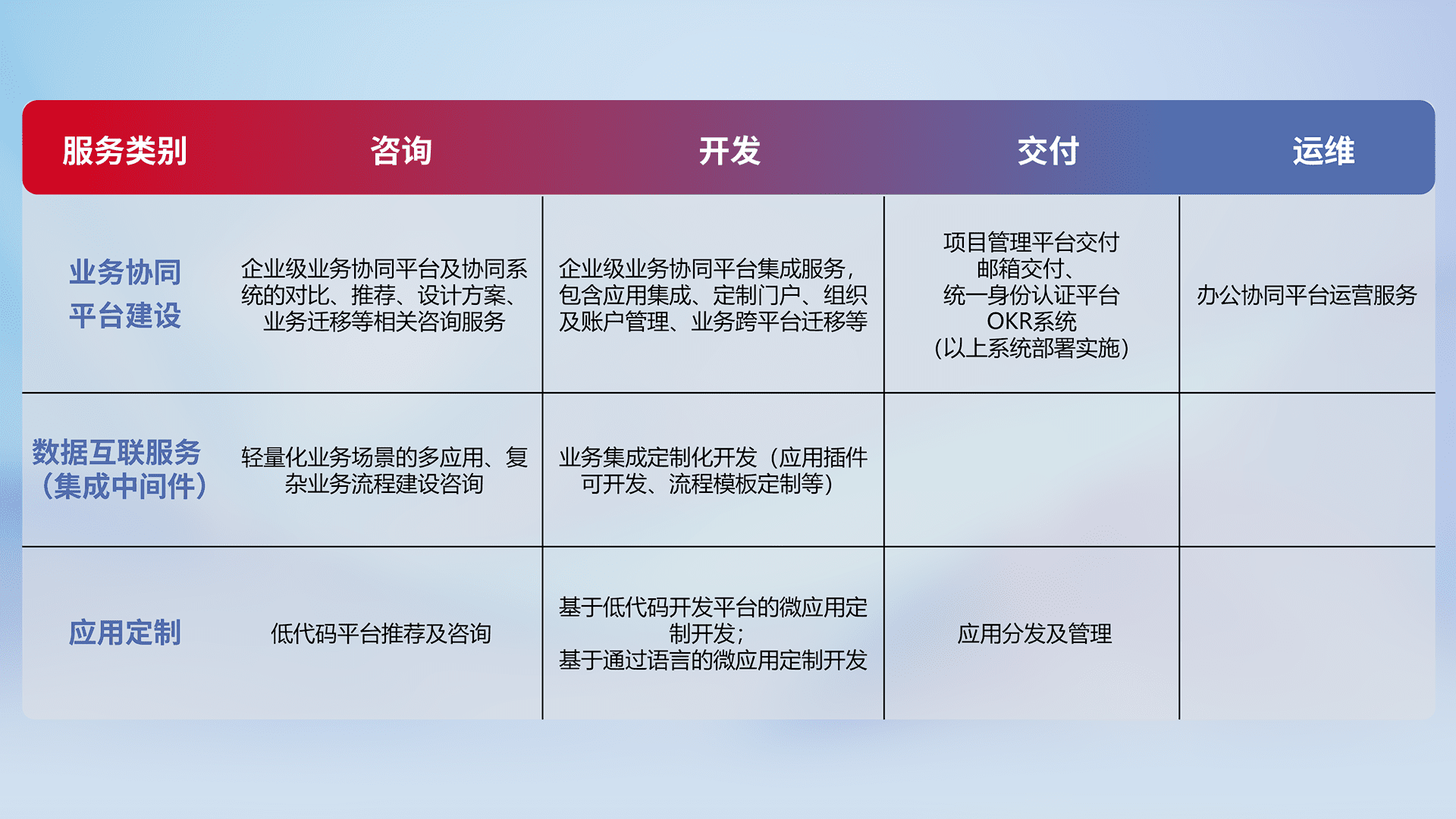 针对钉钉、、企微、、、IDaas等平台级产品提供产品的规划、、方案、、、交付、、、、定制化开发等服务,,,实现如统一协同办公、、、智能客户服务、、、、混合会议管理、、、智能数据查询、、等业务场景,,实现数字化转型。。